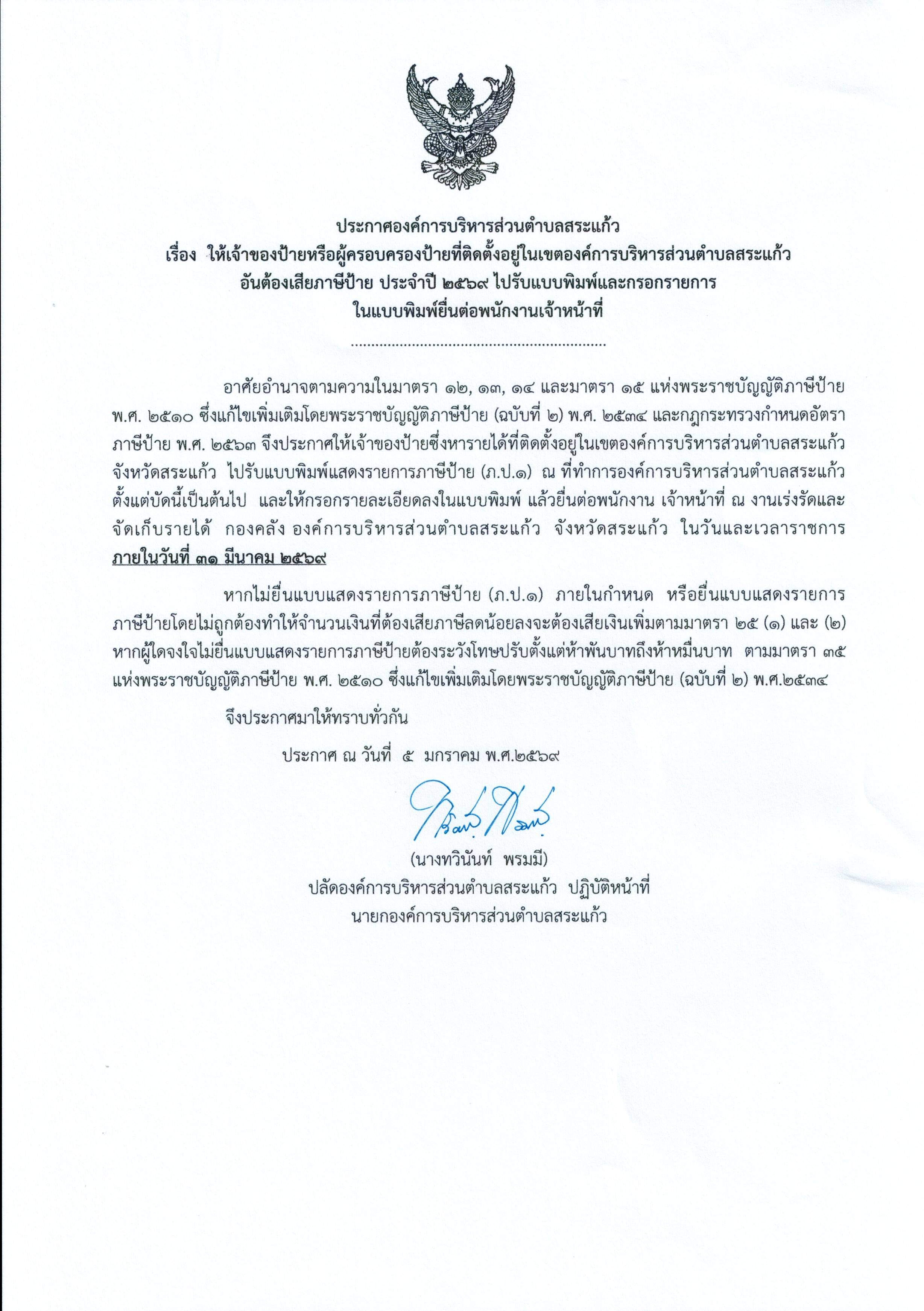 ประกาศ ให้เจ้าของป้ายหรือผู้ครอบครองป้ายที่ติดตั้งในเขต อบต.สระแก้ว อันต้องเสียภาษีป้าย ประจำปี 2568 ไปรับแบบพิมพ์และกรอกรายการในแบบพิมพ์ต่อพนักงานเจ้าหน้าที่ |